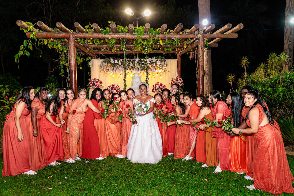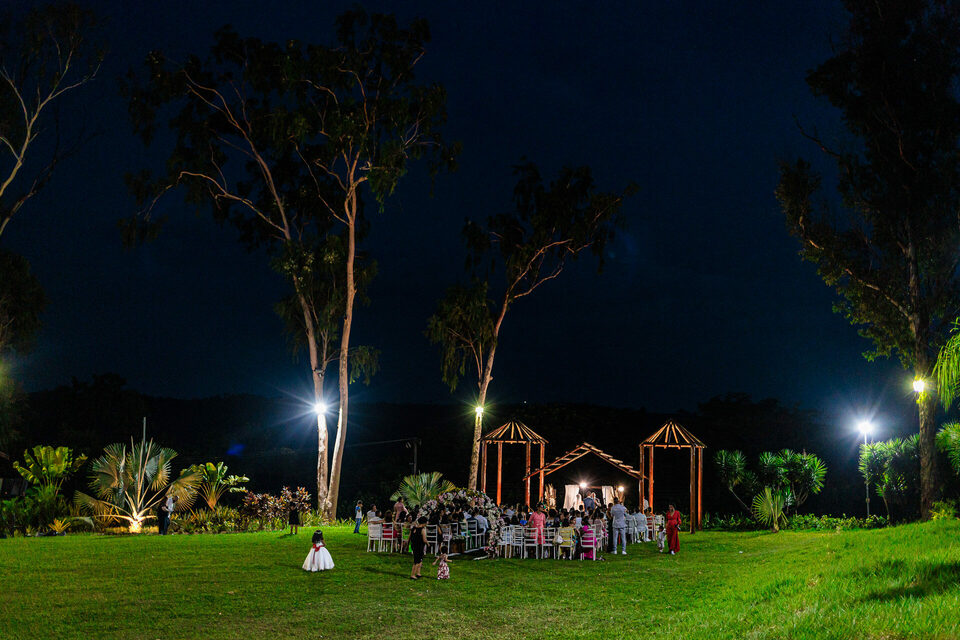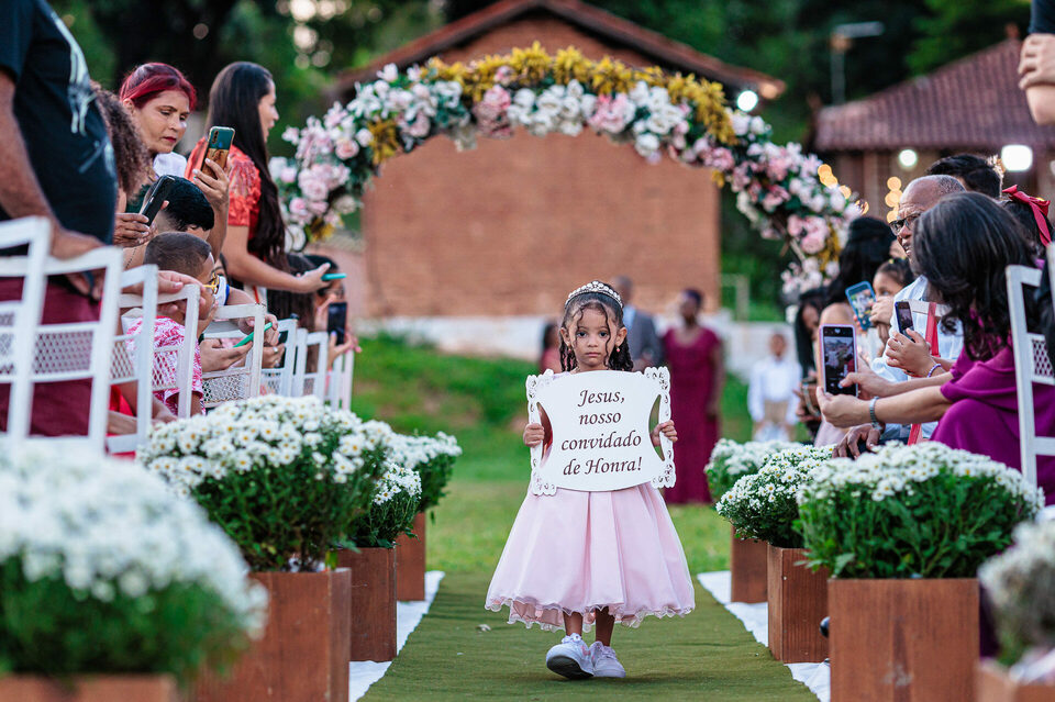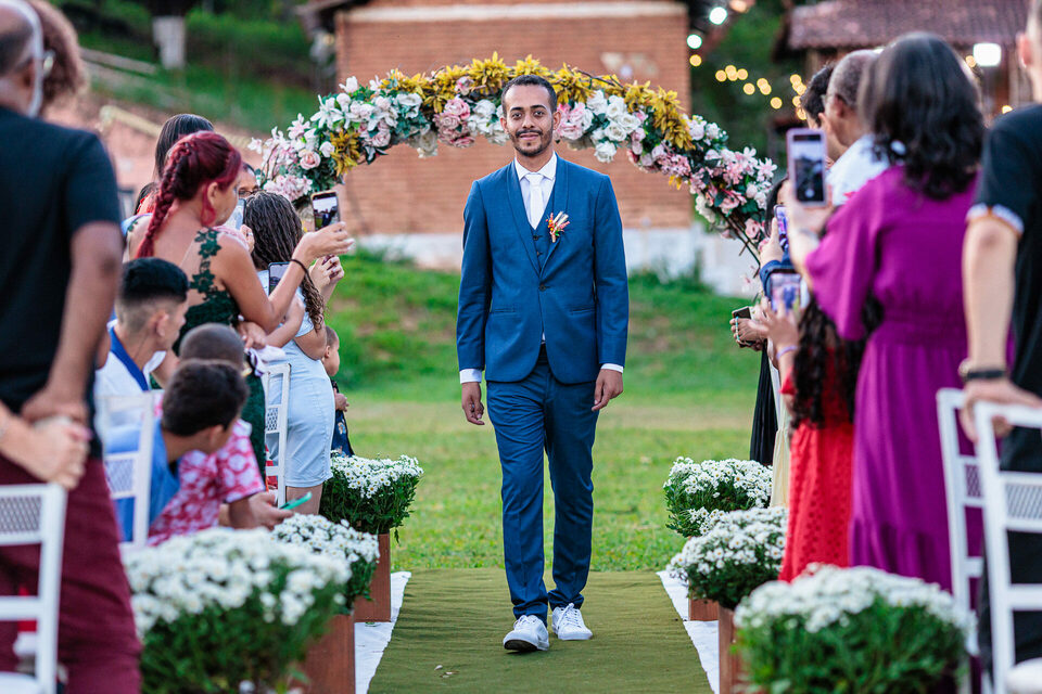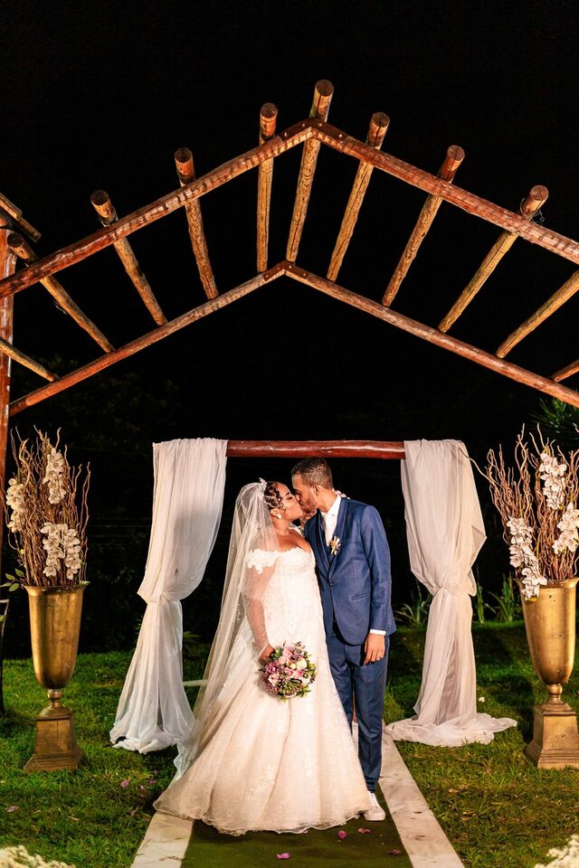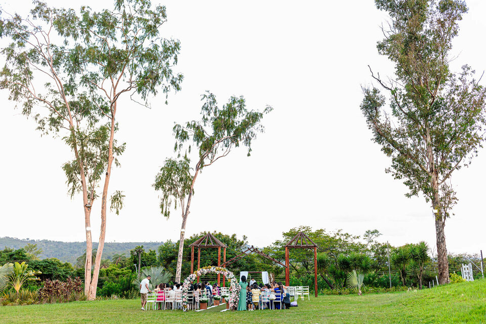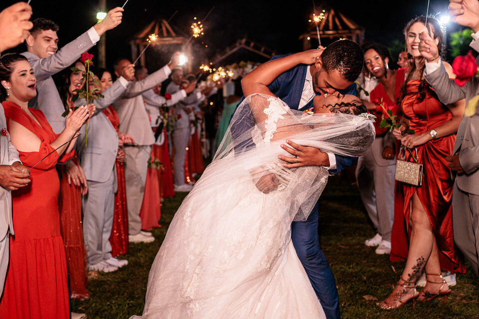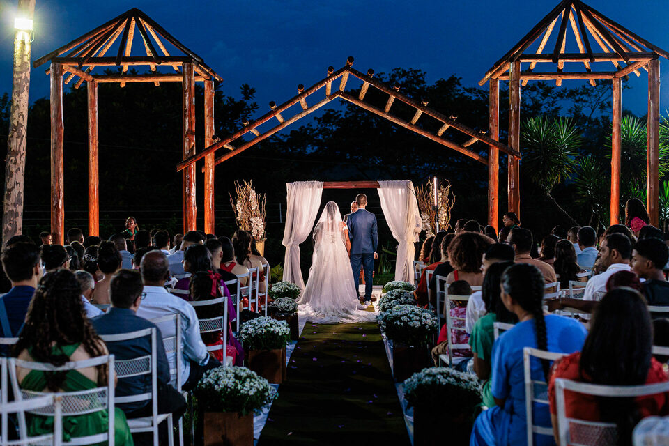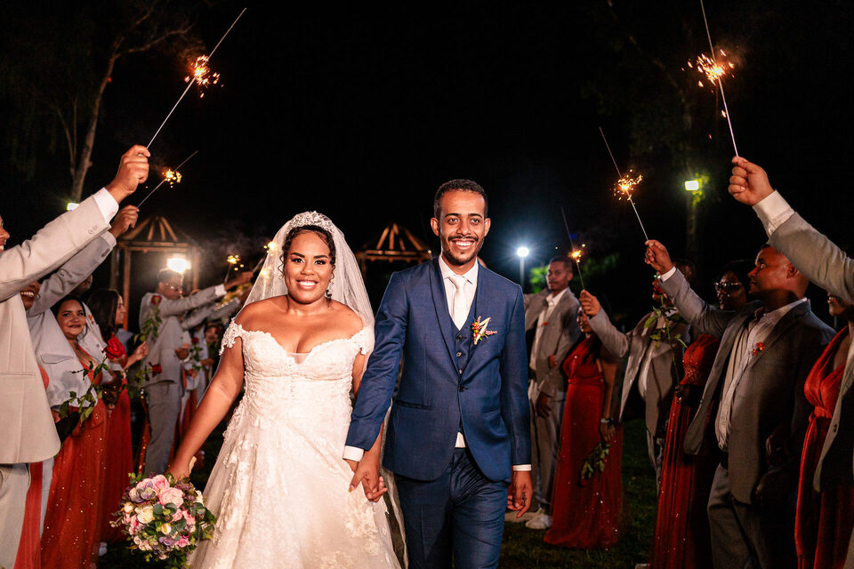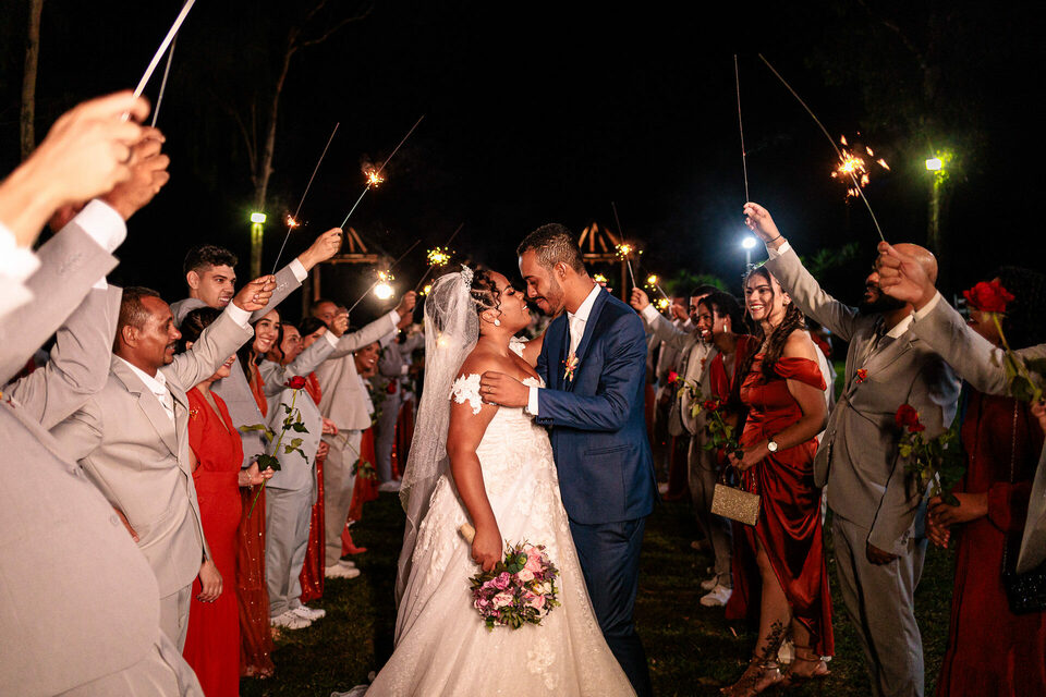 A cerimônia ao ar livre foi uma fusão de sentimentos genuínos e uma atmosfera única. Cada voto trocado, cada olhar compartilhado, foi imortalizado em meio à natureza exuberante que os cercava. Na saída, os padrinhos criaram um corredor mágico com sparkles, iluminando o caminho dos recém-casados de maneira espetacular, transformando o momento em uma cena digna de um filme romântico.