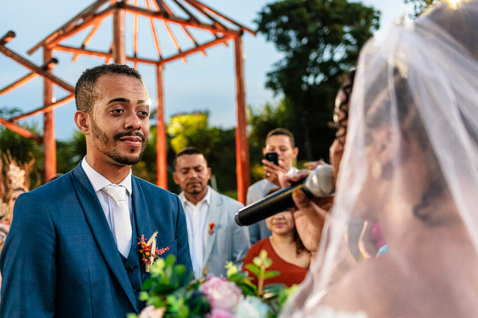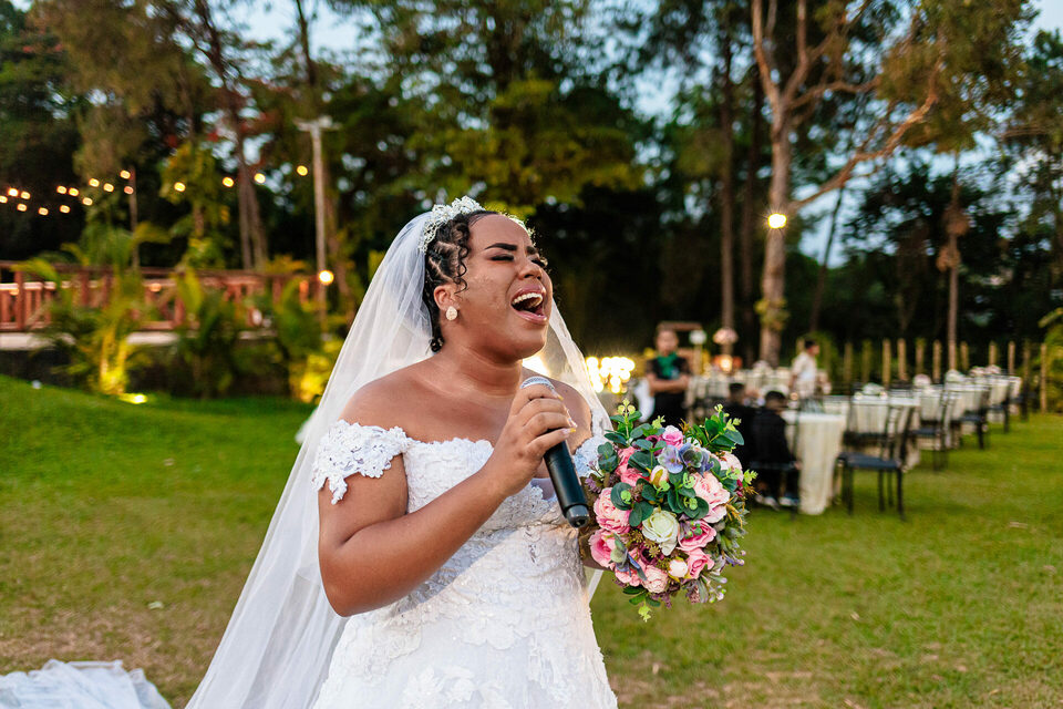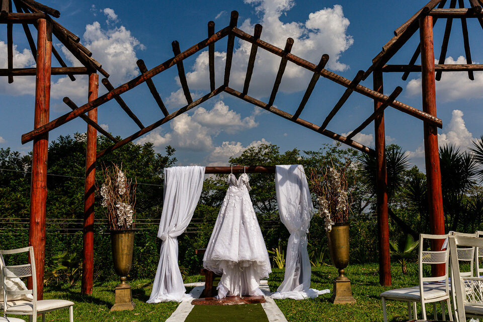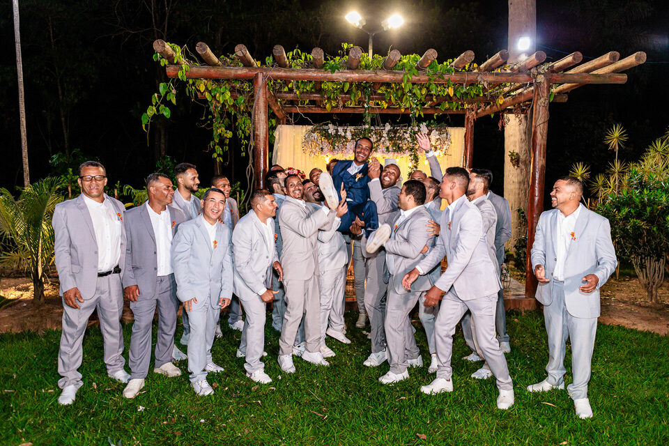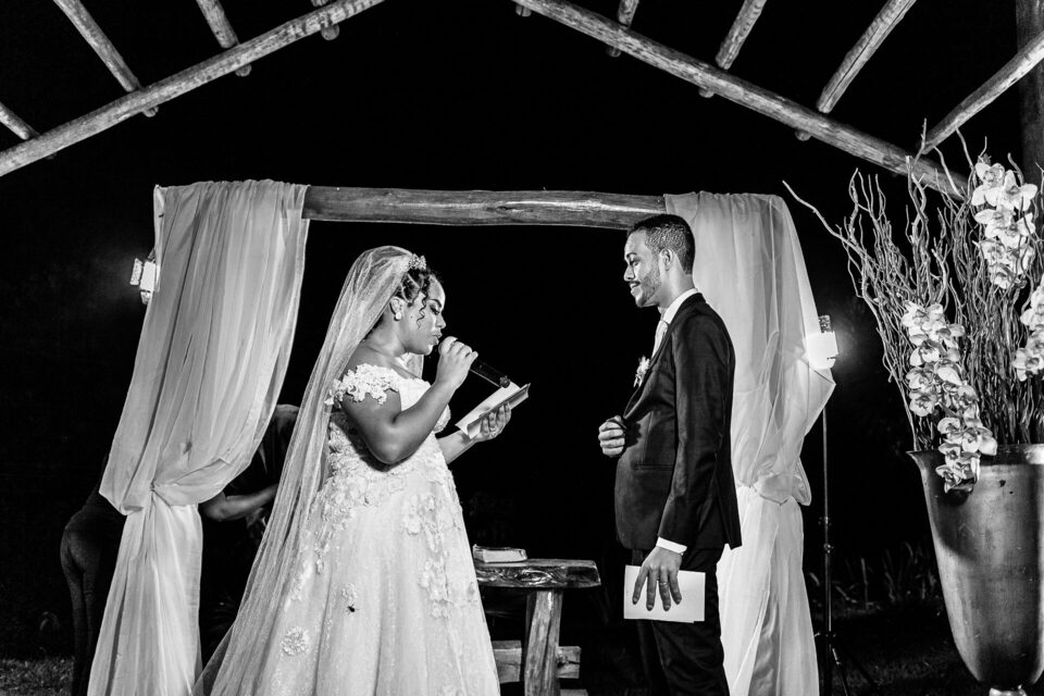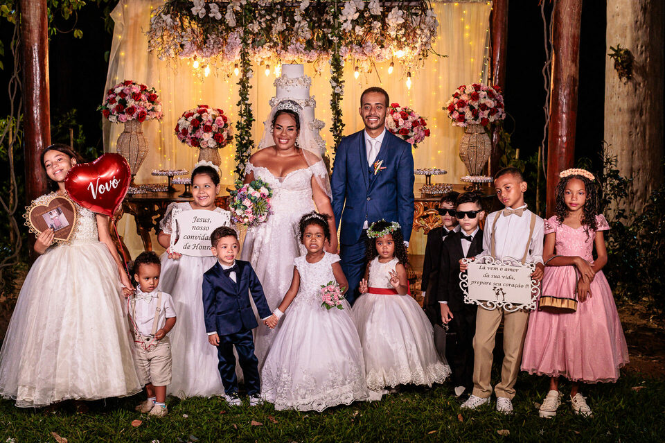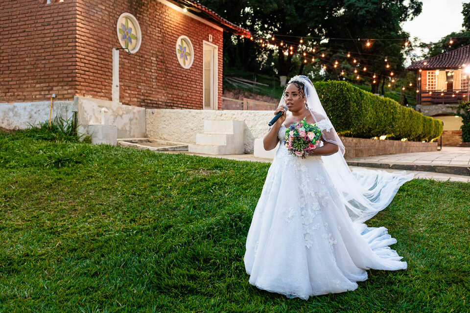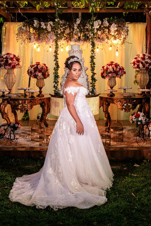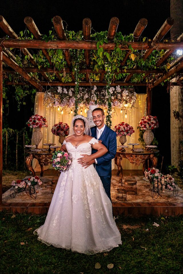 A cerimônia ao ar livre foi uma fusão de sentimentos genuínos e uma atmosfera única. Cada voto trocado, cada olhar compartilhado, foi imortalizado em meio à natureza exuberante que os cercava. Na saída, os padrinhos criaram um corredor mágico com sparkles, iluminando o caminho dos recém-casados de maneira espetacular, transformando o momento em uma cena digna de um filme romântico.