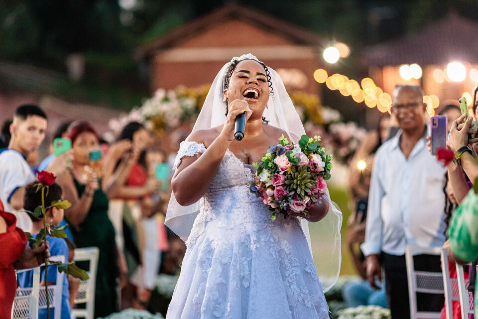 E então, o momento mágico aconteceu quando Ana Luiza, com uma voz que ecoava como melodia, entrou cantando, surpreendendo a todos e provocando uma reação emocionada de Samuel, profundamente tocado pela presença e pela voz da noiva.