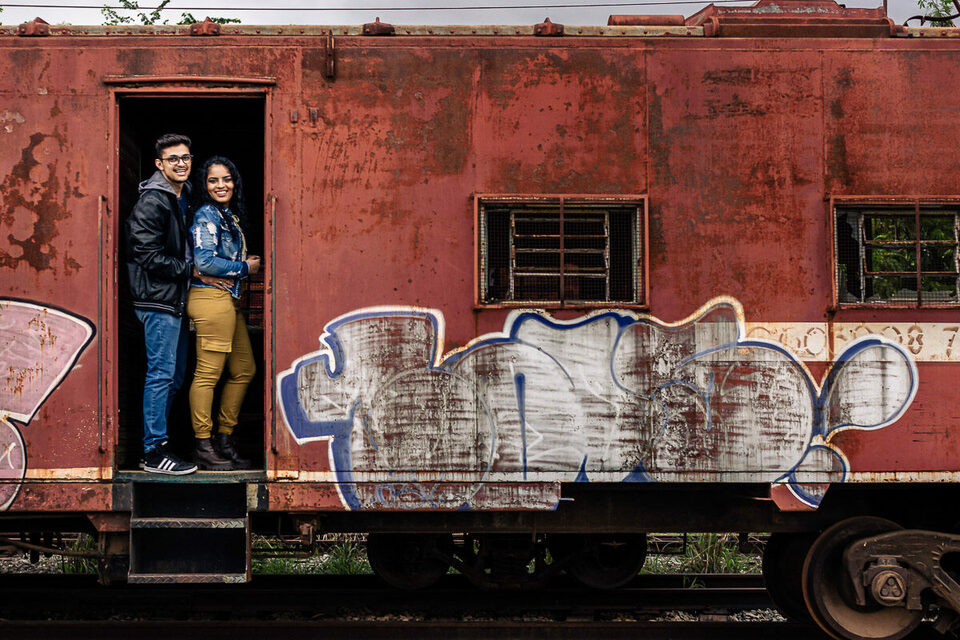 O ensaio foi muito legal, vários vagões de trem abandonados, um casal romantico e um fotografo azarado, digo azarado porque eu furei o meu pé em um mato seco, isso mesmo, um mato seco. Eu ao me posicionar no melhor ângulo para fazer a foto piso em um mato seco que atravessa o meu tênis e fura o meu pé, o que me deixou mancando por 5 dias, mas isso não é motivo para o ensaio parar... continuamos o ensaio e saímos de lá já a noite.